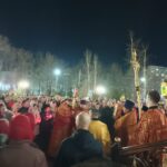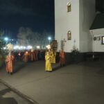 Ночное богослужение началось около 23 часов с Пасхальной полунощницы – короткой службы, после которой духовенство и миряне под непрекращающийся звон колоколов совершили крестный ход вокруг храма, символизирующий движение навстречу воскресшему Спасителю.